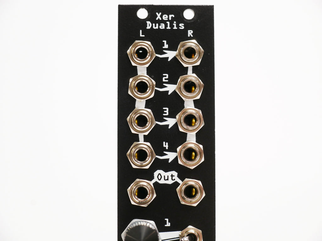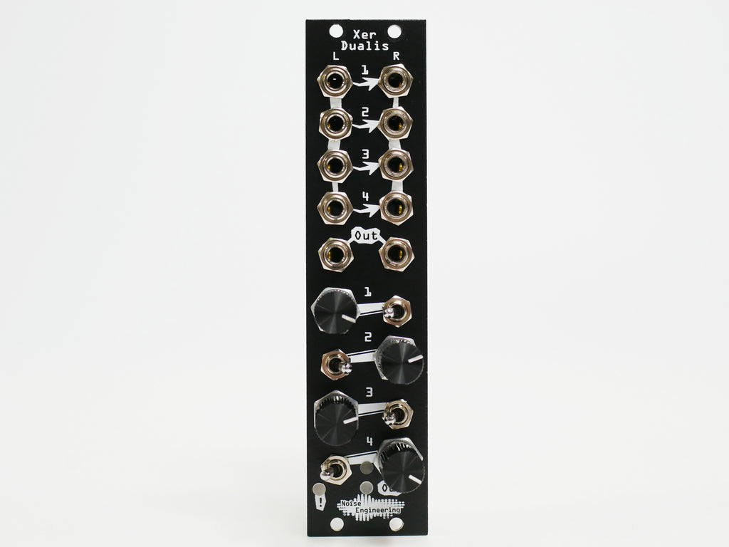 チャンネルごとにミュートスイッチとレベルコントロールノブを搭載しています。内部結線により、左chのみに信号を入力すればモノラルで使用できます。
