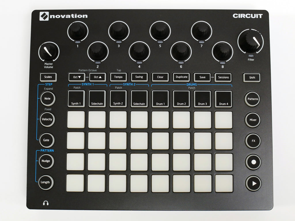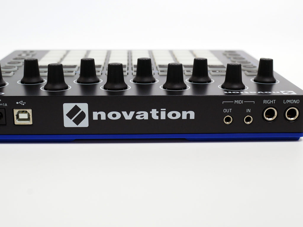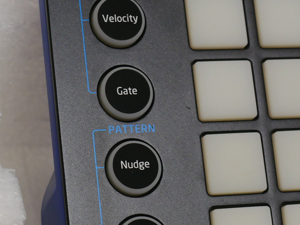 32のベロシティ対応のパッドがモードによってシーケンサーや鍵盤、ドラムパッドに切り替わり、 各パートの打ち込みや演奏に使用します。上部のツマミもモードにより機能が切り替わり、主に音色の調整に使用します。電池駆動でスタンドアローンでも動作し、内蔵スピーカー、ヘッドフォン端子も搭載しているので 移動中でも楽曲の打ち込みやスケッチが可能です。