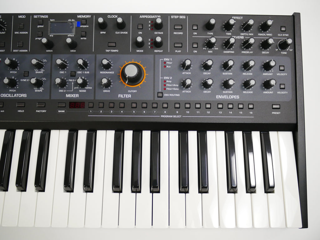 2基のアナログVCOと、Prophet-5 Rev4から受け継がれた4ポールのレゾナント・アナログ・フィルターを搭載しています。Sequentialでは初の「ロースプリット機能」により、44鍵の範囲を超える演奏が可能です。ボイスとボイスとの間のチューニングのズレを再現し、ノブを回すとヴィンテージ感のある温かいサウンドへ変化する「VINTAGEノブ」も備えています。エフェクトは1系統のマルチエフェクトと1系統のリバーブ、合計2系統のデジタル・エフェクトが用意されています。64ステップ・シーケンサーとアルペジエーターも搭載しています。