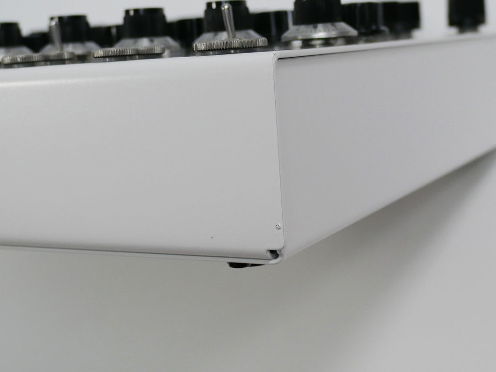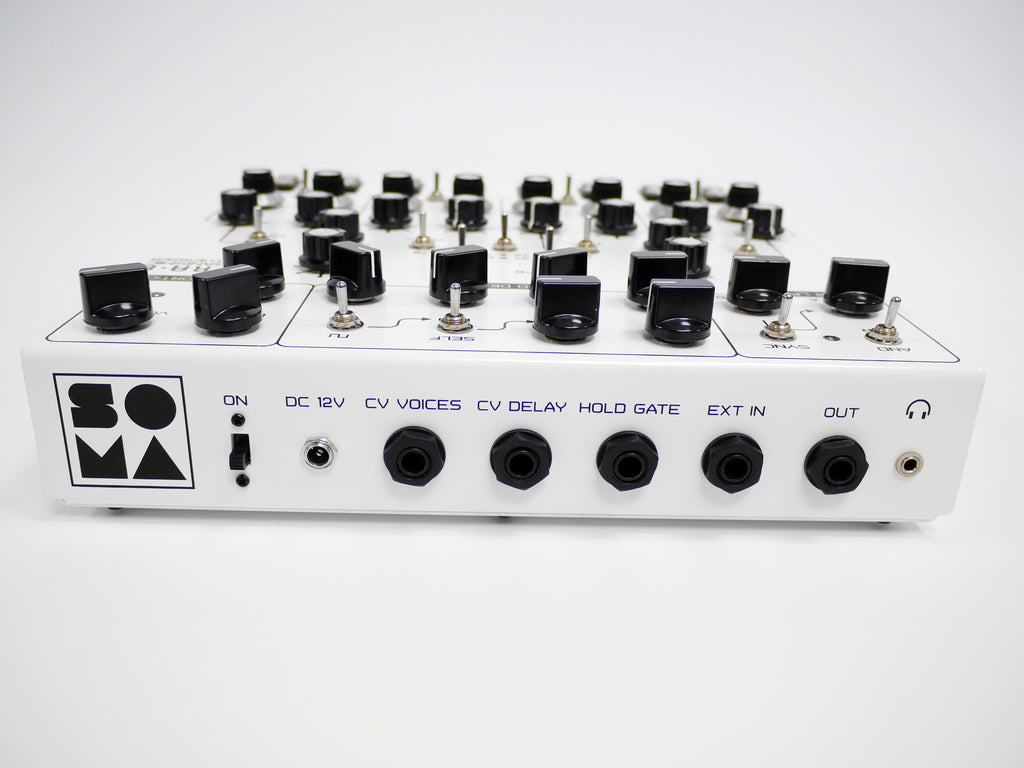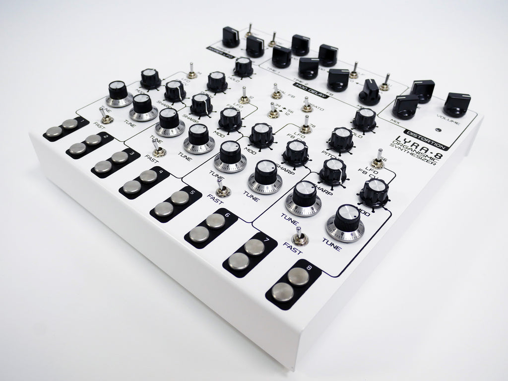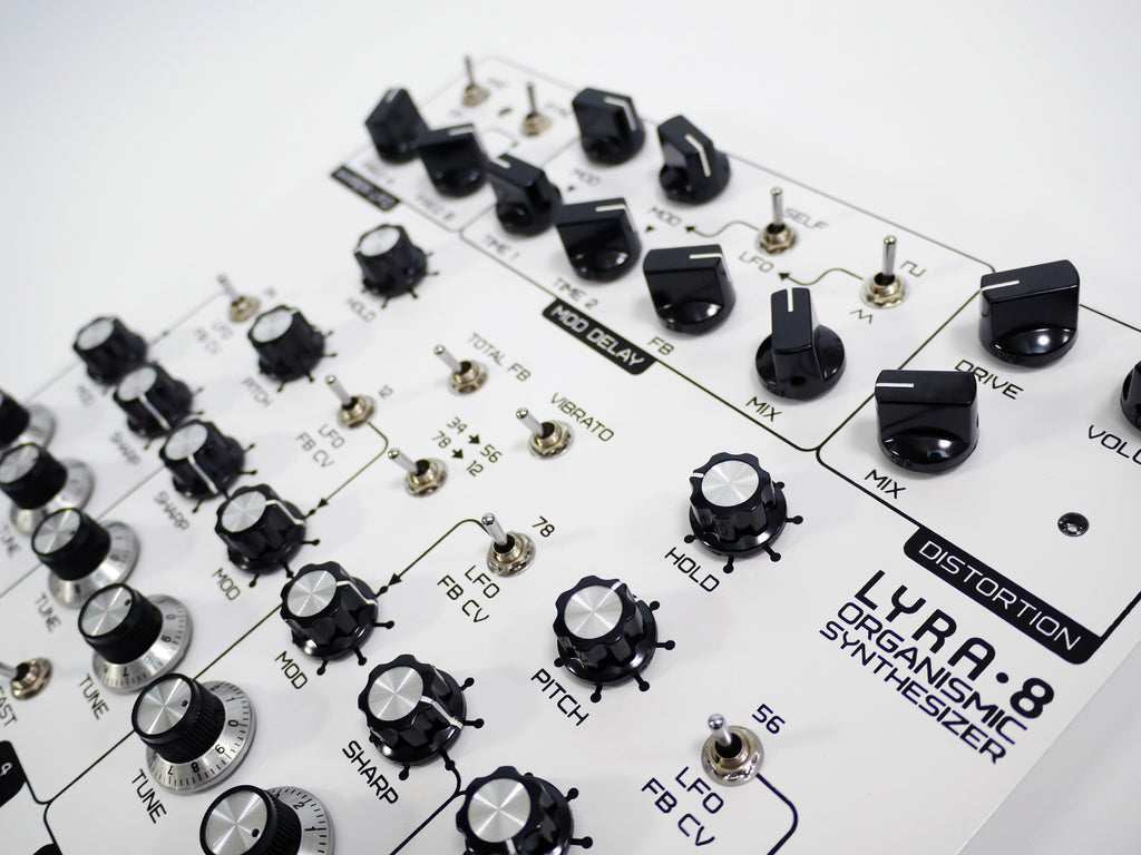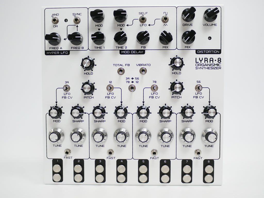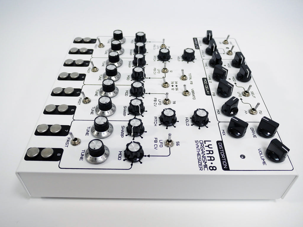 様々な変調が可能な8つの音源セクション→変調可能な2つのディレイ→オーバードライブ の基本構成を元に音作りや演奏ができるシンセサイザーです。