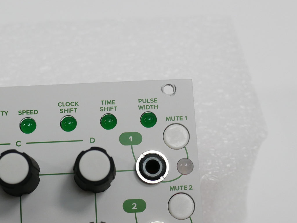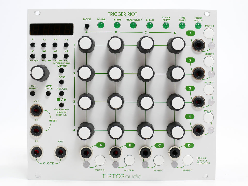 横4チャンネル、縦4チャンネル、合計8チャンネルのシーケンスを同時に出力します。1チャンネルにつき、その列に並んだ4つのエンコーダーで設定したディバイドレートによるトリガー信号がミックスされ、各アウトプットから出力されます。作成したパターンは4パターン x 4バンク保存でき、リアルタイムに切り替えて演奏できます。